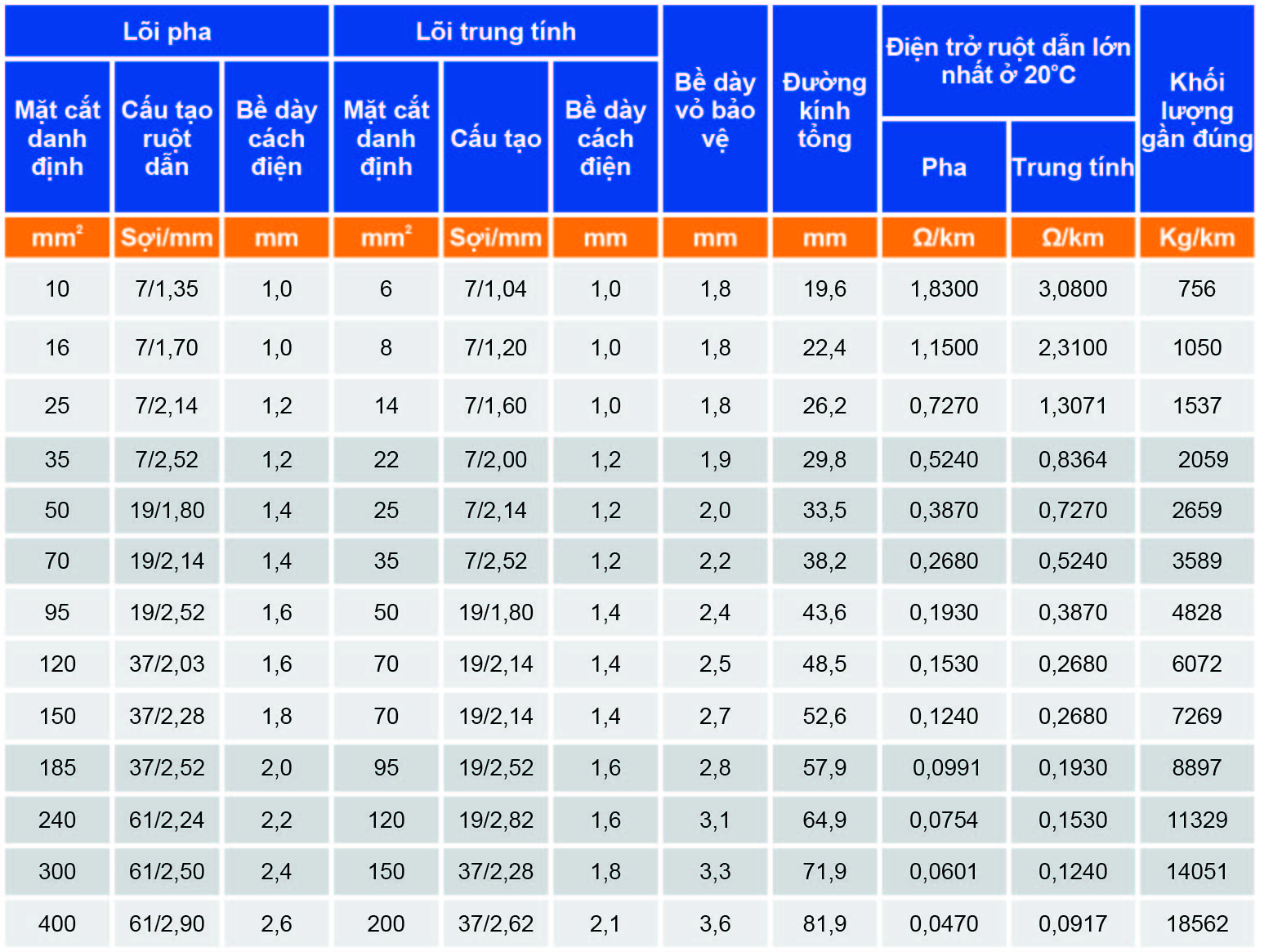 Cáp điện lực 3 pha + 1 trung tính, ruột đồng, cách điện PVC - 0.6/1KV, vỏ bọc PVC